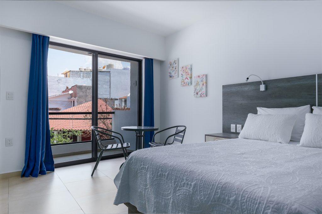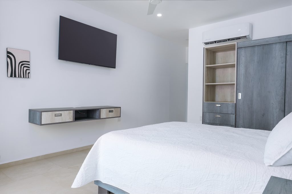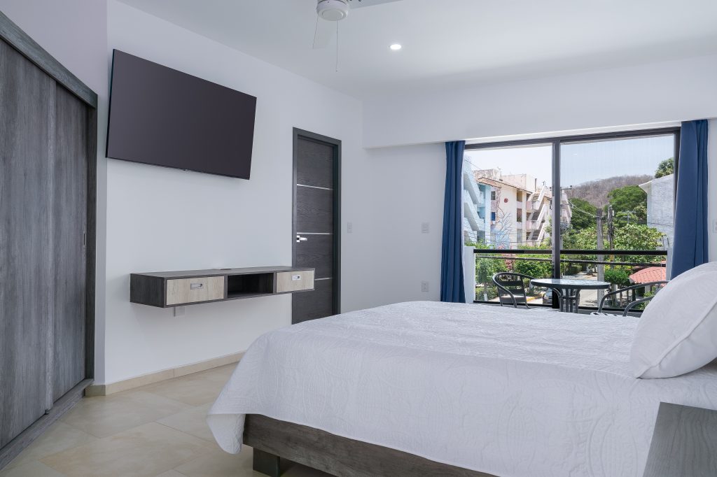 This room offers a cozy atmosphere equipped with a Queen Size bed, 55” Smart TV, a small table with two chairs and a work area. You will be able to enjoy the afternoon breeze from your balcony, as well as the large amount of natural light that enters through the large window.